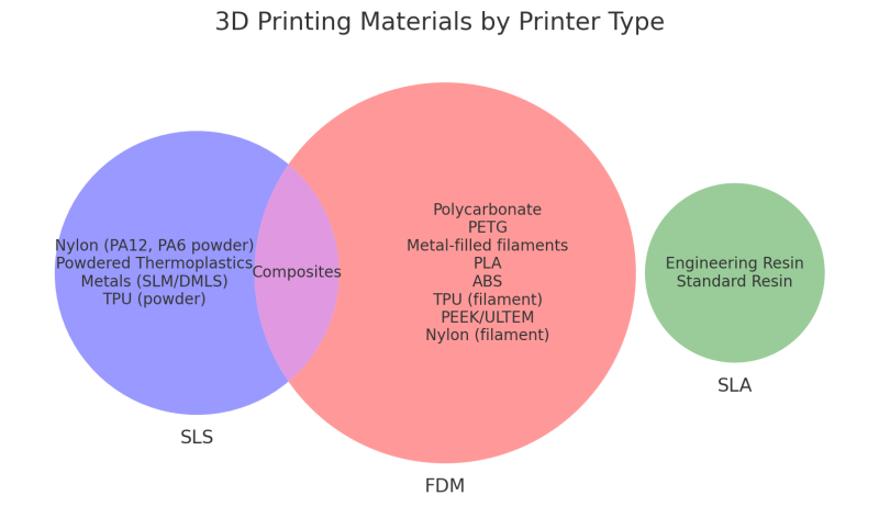 Venn diagram showing 3 bubbles. Each bubble represents a different 3D printing technology, which are FDM, SLS and SLA. Inside the bubble is a list of materials each prints can use.